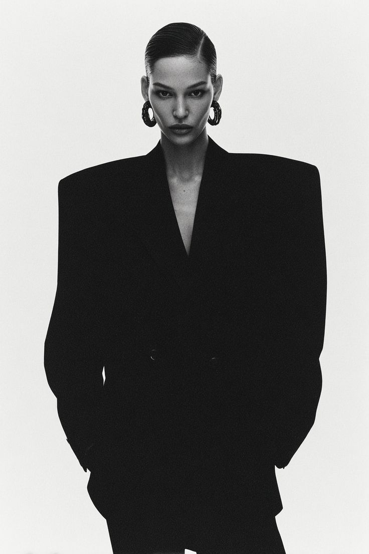 Wyrazista marynarka o mocno zarysowanej linii ramion i architektonicznej formie, inspirowana siłą nowoczesnego krawiectwa. Minimalistyczna, a jednocześnie dramatyczna w wyrazie, redefiniuje klasyczny tailoring poprzez odważne proporcje i ponadczasową elegancję. To manifest pewności siebie zamknięty w formie.